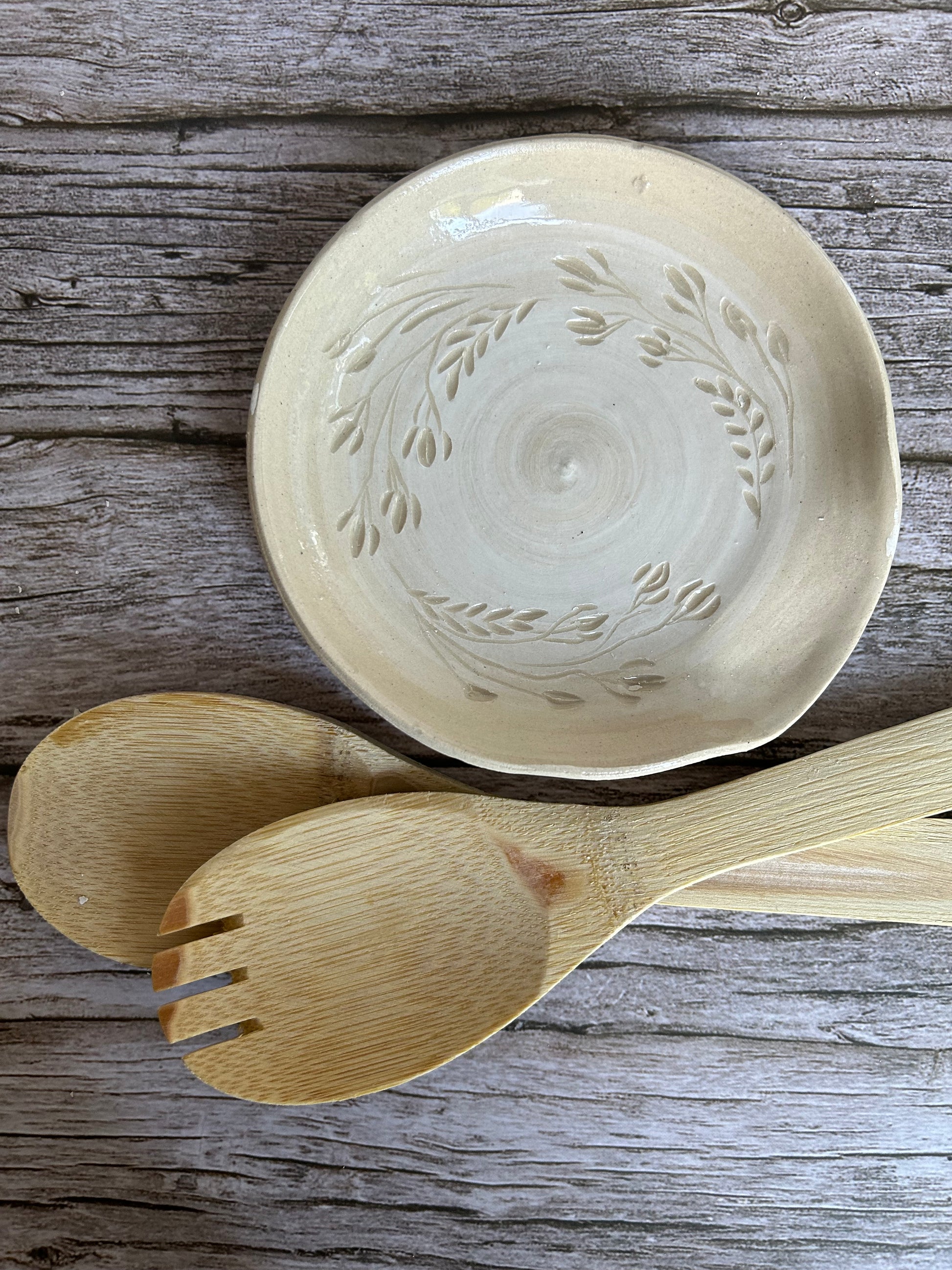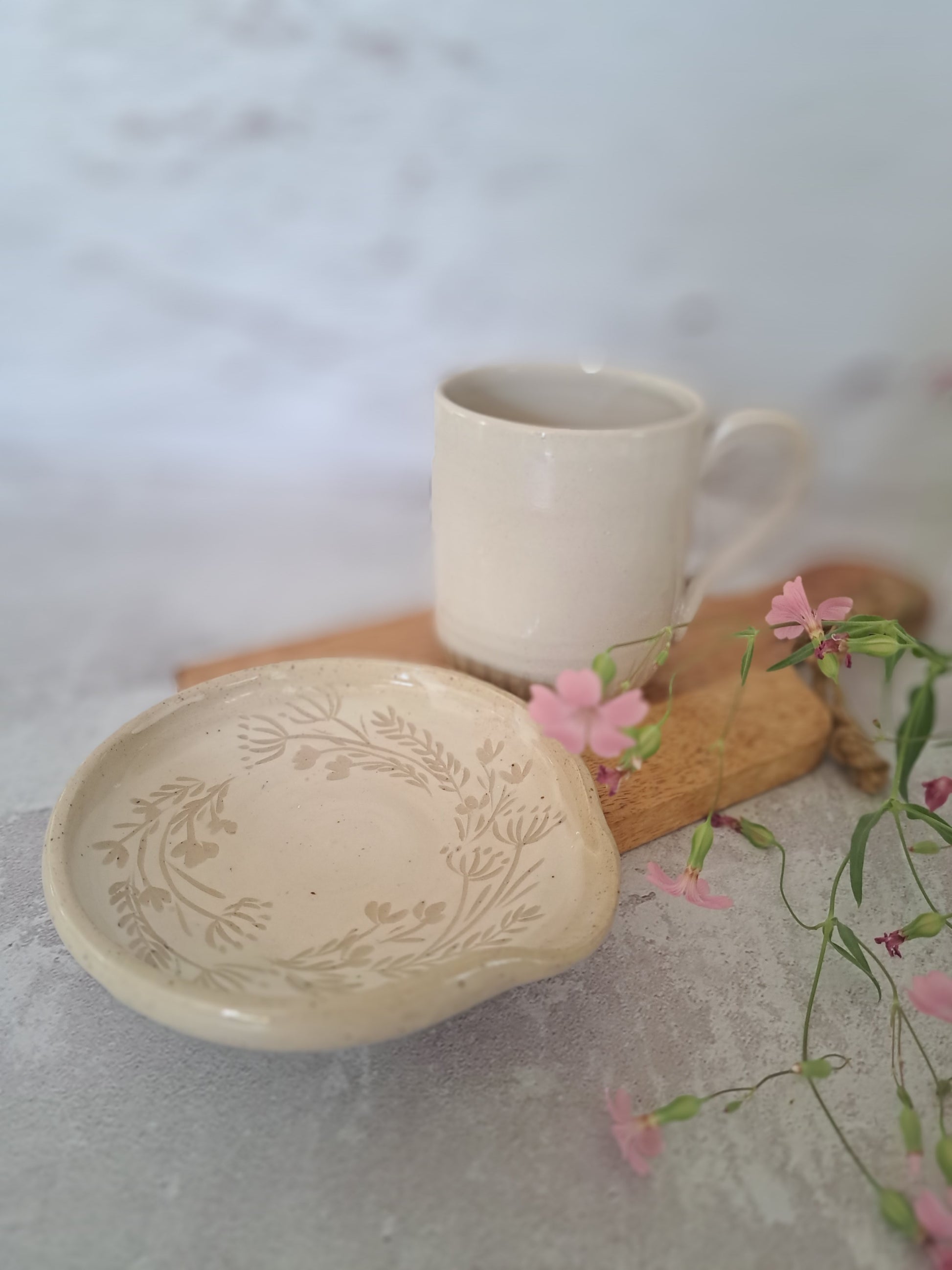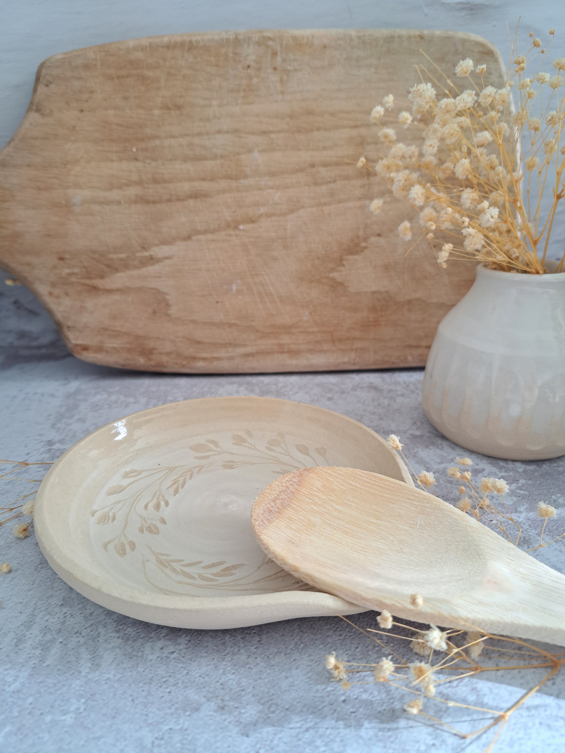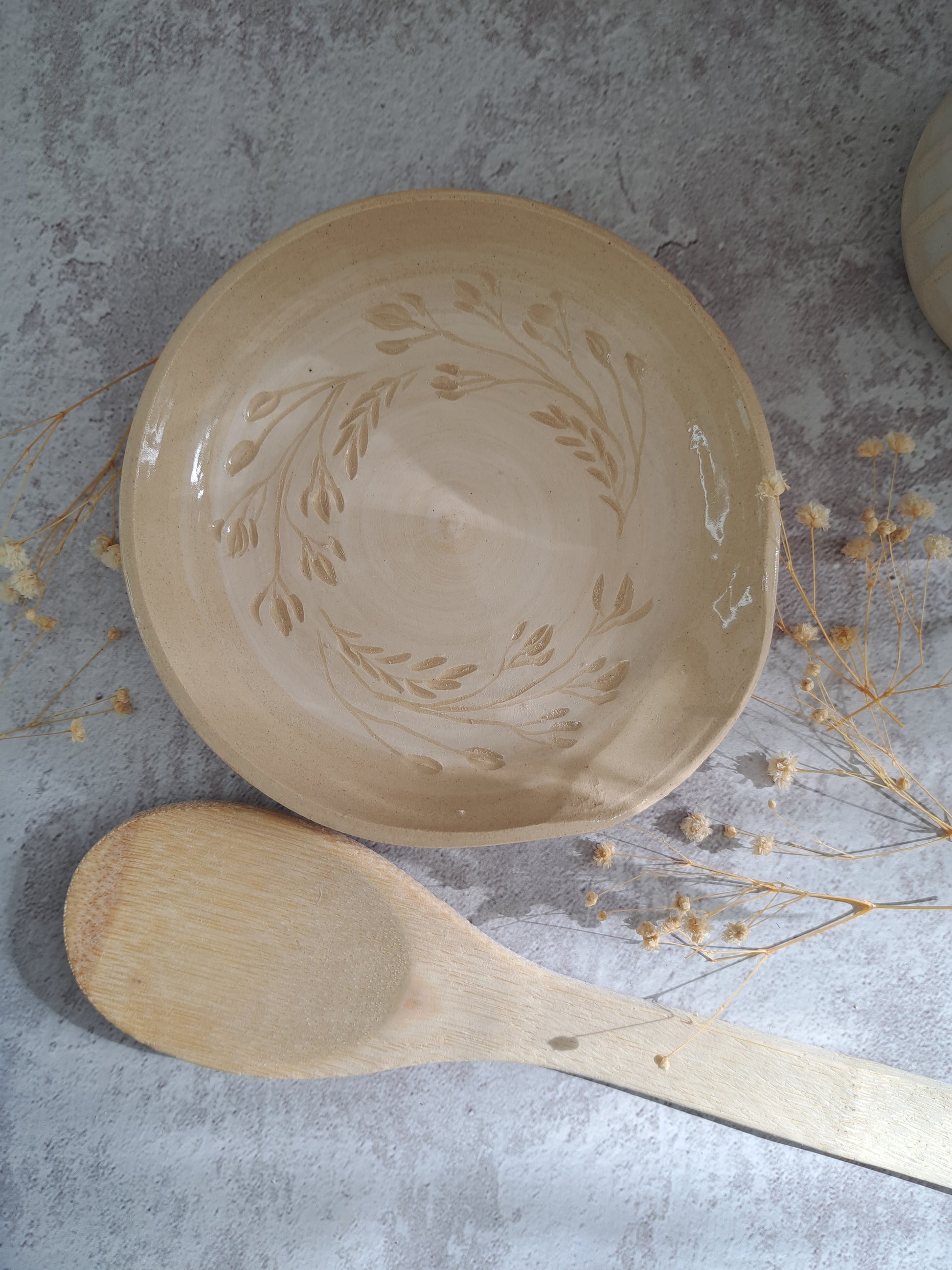 עשויה חימר לבן, מעוטרת בחריטה בעבודת יד